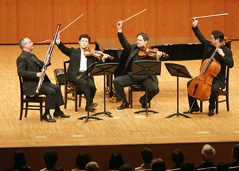 初日はラベルのバイオリンとチェロのためのソナタ、サンサーンスのピアノ五重奏曲など5曲を披露した。樫本さんはドビュッシーのピアノ三重奏曲、ドビエンヌのバスーン四重奏曲など3曲に登場。美しい室内楽の調べに満席の聴衆が聴き入った。