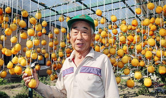 民家に隣接した約300平方メートルの畑に柿の木が大小7本。その奥にプラスチック波板で雨よけをした下に、ひもで数珠つなぎしたオレンジ色の果実が何本もぶら下がっていた。