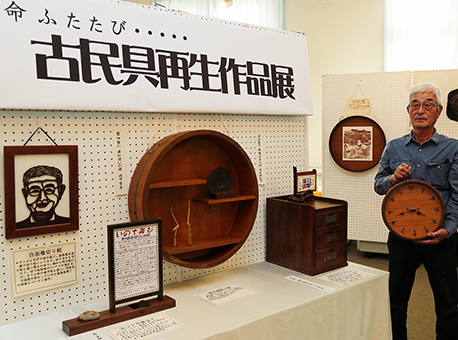 お釜の蓋を文字盤に利用した掛け時計はおはじきや学生服のボタンを時刻の目盛りに埋め込んだ。小さな穴を複数空けた一斗枡の中に電球を取り付けたランプシェード、寿司桶をフレームに仕立てた飾り棚などアイデアと工夫を活かした作品が並ぶ。