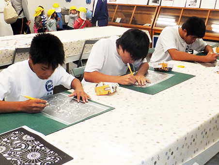 形藍染の体験教室は、美術的・歴史的にも極めて貴重な染形紙に興味を持ってもらおうと同館が企画した。スタッフと「トライやる・ウィーク」の中学生が形紙の文様をクリアファイルに写し取り、形を復刻。「菊七宝」、「桜に唐草」、「市松」など8種類から柄を選べる。