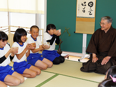 多目的室に畳を敷いて掛物と花入を飾り、即席の茶室に模様替え。お辞儀の所作や茶せんの使い方、道具を拝見するときのマナーなどを一通り稽古した。同校の卒業生で西山氏の姪にあたる治代さんは、西山氏が遺した茶杓の名品「苫屋」「日本一」を持参し、子どもたちに披露した。