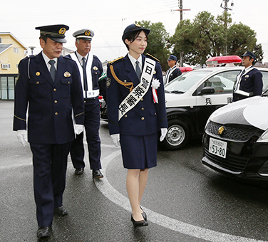 りりしい制服姿で登壇した瀧谷さんは「私たち赤穂市民が平穏な年末年始を迎えられるように、力強く、そして温かい活動を期待しています」と訓示。「寒さの厳しい中、お体に十分注意して職責を果たして」と励まし、パトカーや白バイで街頭パトロールへ出発する署員らを見送った。