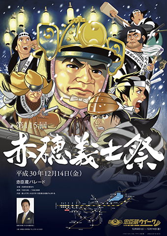 赤穂義士祭は12月14日(金)午前10時に「忠臣蔵パレード」が赤穂城大手門前をスタート。お姫様姿の赤穂義士娘が人力車に乗って登場する「義士娘人力道中」、ちびっこたちが討ち入り装束を着けたちびっこたちの「こども義士行列」、忠臣蔵の名場面を再現した山車など総勢約900人で元禄絵巻を繰り広げる。