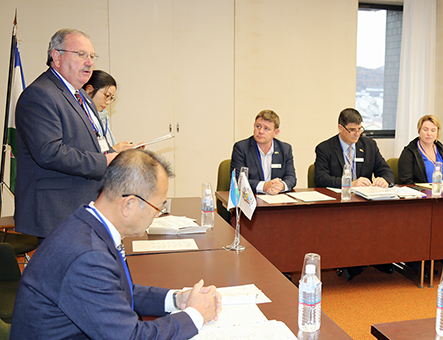 訪問団を代表して公式会議であいさつするバリー・サメルズ市長(左)