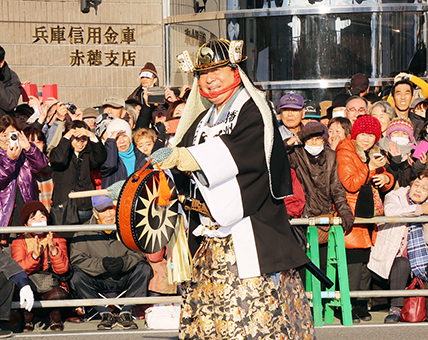 義士行列は高橋さんが打ち鳴らす陣太鼓の合図で一歩ずつ前進。観覧席前に勢揃いして「エイ、エイ、オー」と勇壮に勝どきを上げた。高橋さんは「忠臣蔵は日本の文化。(義士行列の内蔵助役は)一度はやってみたかった」と多忙なスケジュールの中、オファーを引き受けた理由を話し、観客からの盛んな声援に満面の笑みで応えた。