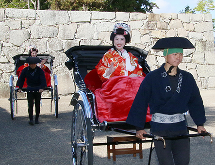 パレードは上仮屋の赤穂城大手門前から特設観覧席がある加里屋の「息継ぎ井戸」まで約1キロのコース。参勤交代をイメージした大名行列、子ども義士行列、忠臣蔵名場面を再現した山車などが続き、この日がお披露目となった第34代赤穂義士娘の2人はお姫様姿で人力車に乗って沿道に笑顔を振りまいた。