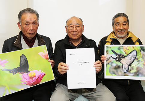 ▼蝶の羽化率を通年観察=地元が誇る豊かな自然への関心を高めようと、南野中の木村繁之さん(82)と高雄の尼子公一さん(73)、木津の山下一之さん(71)がジャコウアゲハのさなぎを通年観察した成果を調査報告書として刊行。