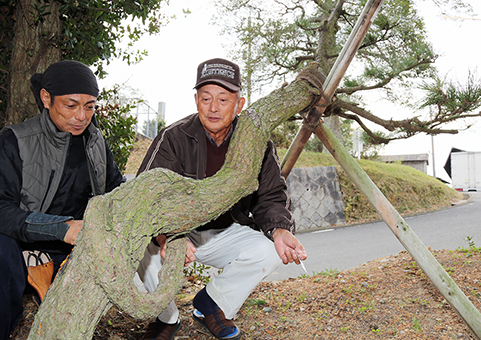 国岡さんによると、このクロマツは亡父が今から約40年前に幼木を植えたもの。当時小学生だった国岡さんの長男がいたずら心で幹を輪っかに結び、そのまま木が成長したのだという。