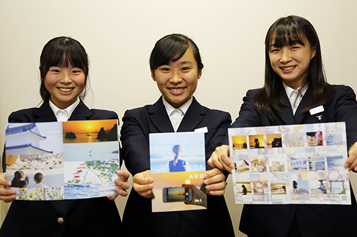 「自分たちが感じたまちの魅力が伝わったのがうれしかった」と3人。パンフレットはJR播州赤穂駅2階の観光案内所で無料配布するほか、インターネット上でも閲覧できるようにデジタル版を公開する予定だ。