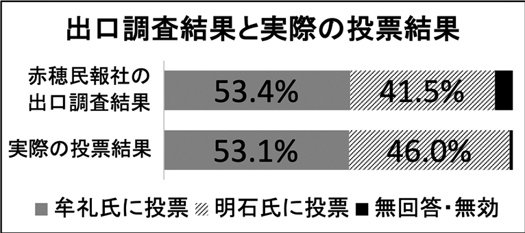 調査は、期日前投票は16日から19日まで市役所をはじめ4カ所、20日の投票日は8カ所で行い、合計1430人から回答を得た。