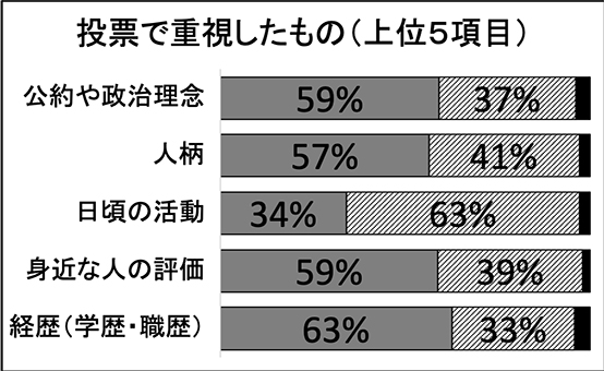 「投票の際に最も重視したのは?」の問いで(1)公約や政治理念(33%)(2)人柄(18%)(3)日頃の活動(9%)(4)身近な人の評価(7%)(5)経歴(5%)が上位5項目だった。全体の3分の1を占めた「公約や政治理念」を重視した有権者の6割近くが牟礼氏に投票。「人柄」「身近な人の評価」「経歴」でも上回った。明石氏は「日頃の活動」を重視した人から6割を超えて得票した。