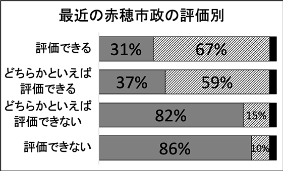 「最近の赤穂市政運営についてどのように感じていますか」の問いには、▽評価できる(14%)▽どちらかといえば評価できる(43%)▽どちらかといえば評価できない(27%)▽評価できない(9%)と回答があった。現市政に否定的な評価を下した層の8割以上が牟礼氏に投票したのに加え、肯定的に評価した層からも3割以上の票が牟礼氏へ投じられた。