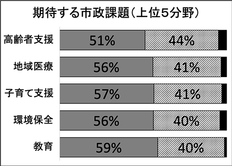 「次の市長に特に取り組みを期待するのは?」の問いで上位5つは(1)高齢者支援(35%)(2)地域医療(32%)(3)子育て支援(31%)(4)環境保全(27%)(5)教育(24%)だった。これらの市政課題で、いずれも牟礼氏が有権者の期待を集めた。今回のアンケートで設定した16の市政課題のうち、明石氏が上回ったのは「交通安全」の1項目のみだった。