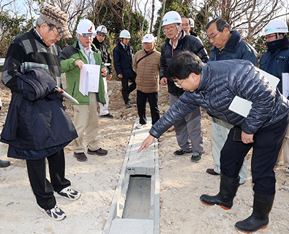 この日は設計コンサルタントと施工業者の案内で現地を視察。雨水を海に流すためのコンクリート製U字溝、地形的に海側への排水が困難なゾーンで雨水を地下に染み込ませる浸透側溝の敷設状況を確認した。