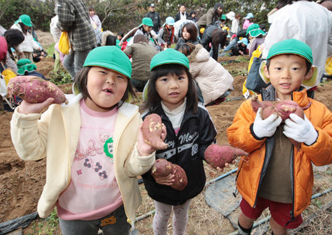 サツマイモを手に笑顔の子どもたち