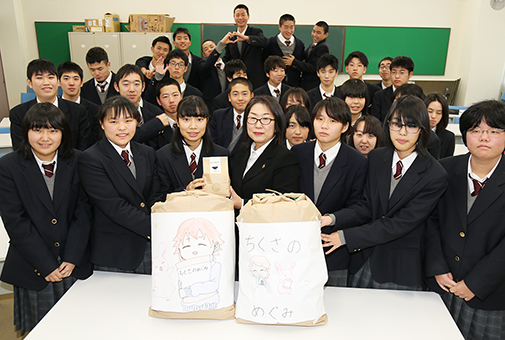 生徒たちは「ちくさのめぐみ」というオリジナルブランド名を付け、手作りの包装紙でラッピング。準備した「子ども食堂班」の寺谷若葉さん(16)は「みんなで田んぼの草抜きを頑張って育てたお米。喜んでもらえたらうれしい。おなかいっぱい食べてほしい」と笑顔で話した。