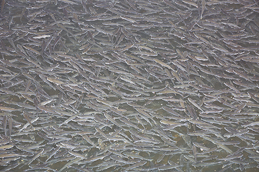 まるで養殖場 大津川にボラの大群