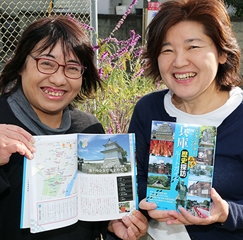 「兵庫ぶらり歴史探訪ルートガイド」を手にする磯本さん(左)と益田さん