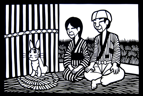 百姓の夫婦は、そのことを近所の仲間に話して聞かせました。(作・切り絵=村杉創夢)