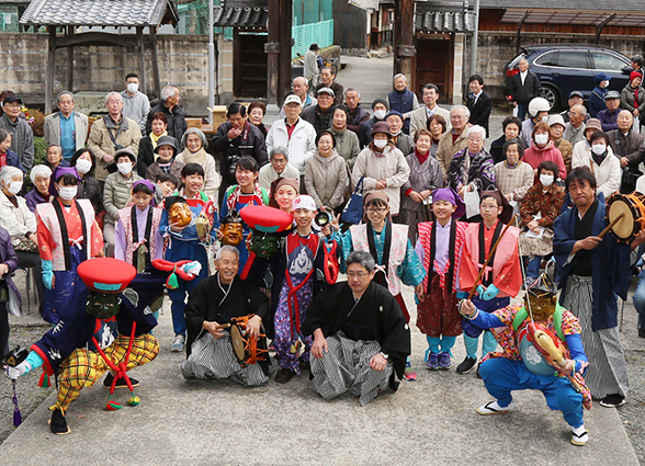 保存会メンバーが指導する尾崎小学校の「恵比寿大黒舞クラブ」の子どもたち9人も衣装を着けて参加。大人の後ろで共演した。3年生から4年間クラブで活動した部長の北條凜玖君(12)=6年=は「大勢の人で緊張した。クラブの活動はこれが最後になるけど、大人になったらまたやってみようかな」。