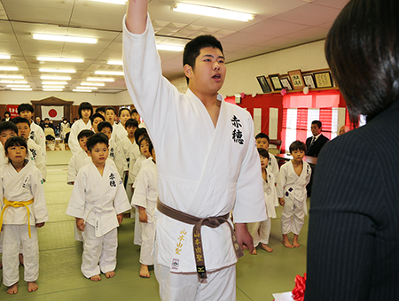 赤穂柔道スポーツ少年団50周年記念大会で選手宣誓する山本由聖君