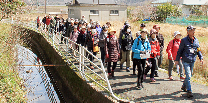 この日はJR坂越駅を出発し、現在も農業用水路として活用されている水路に沿ってウオーキング。塩屋方面へ水を分岐する「戸島枡」などを見学し、息継ぎ井戸がある加里屋の「いきつぎ広場」まで5・5キロを歩いた。