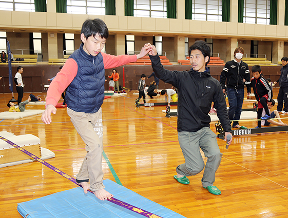 体験会はトップアスリート交流事業として同体育館の指定管理者が主催。小・中学生の親子を中心に約60人が参加した。大杉さんの指導の下、床から30センチほどの高さに張った幅5センチほどのベルトの上に片足で立ったり、一旦しゃがんで立ち上がったり基本動作を練習した。