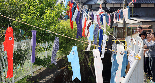 40代の息子が幼いときに着ていた着物をほどいて仕立てたという主婦の一人は「生地の柄を見ると、思い出がよみがえってくる」と風にそよぐこいのぼりに目を細めた。