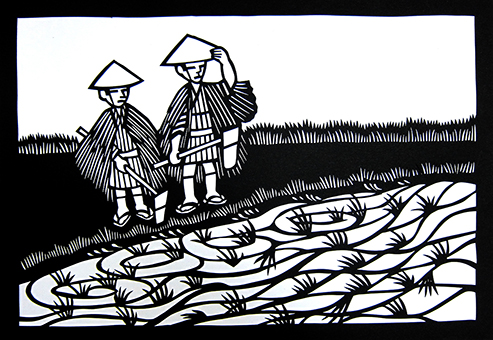 ある年のことです。この年も何度目かの洪水にみまわれ、稲が流されてしまいました。いつものように苗の植えかえをしていると、足元で何かがゴソッ、ゴソッと動いています。お百姓さんは気落ちが悪くなって場所をかえました。でも、しばらくすると、また足元がゴソッ、ゴソッと動くのです。(つづく)