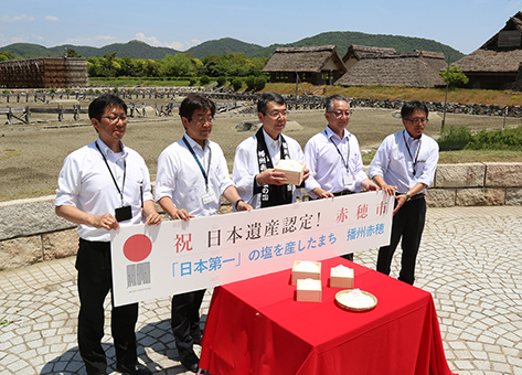牟礼正稔市長は「今回の認定を市民のみなさんと一緒に喜びたい。現在進めている塩回廊構想の整備を加速させるなど地域活性化につなげたい」と抱負。江戸後期の蘭学者・司馬江漢が赤穂を訪れた際の日記に記した「赤穂の塩は日本第一」の文言からタイトルを考案した小野真一・市史編さん担当課長(56)は「赤穂の塩が歴史上、どのような評価をされてきたのかアピールしたかった」と意図を話し、中田宗伯・文化財担当課長(53)は「赤穂市を代表する歴史文化は何かと考えたときに『塩』は外せない。日本遺産に認定されてよかった」と喜びを語った。