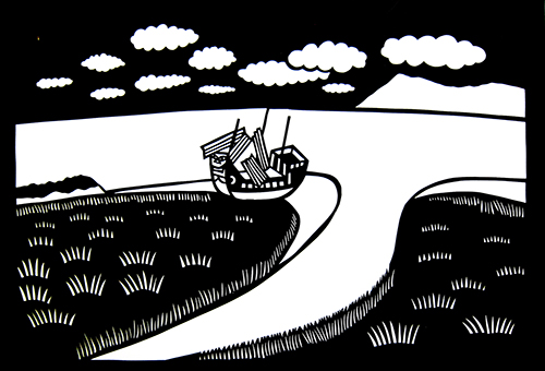 いずれにしても、ドン、ドンと響く音は、人々にいろいろな空想を楽しませてくれます。(赤穂市教育委員会刊『赤穂の昔話 第二集』・「謎を秘める島」より)=切り絵・村杉創夢