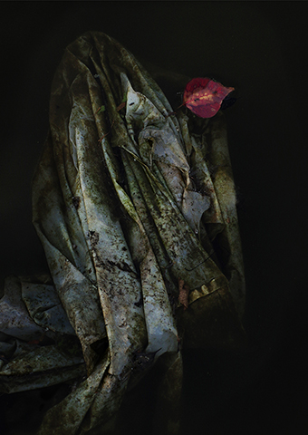 受賞作のモチーフは、うち捨てられた白いビニール袋。昨年11月下旬、被写体を求めて街中を歩いていたとき、赤穂城の堀に浮かんでいるのを見つけ、シャッターを切った。薄汚れ、しわがついた袋に寄り添う落ち葉が悲哀感を引き立てている。「エピローグ」とタイトルをつけて応募した。