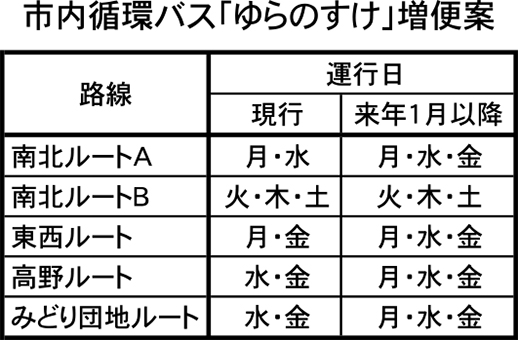 ゆらのすけの運行日数は現在、週3日の南北ルートBを除き、▽南北ルートA▽東西ルート▽高野ルート▽みどり団地ルートの4路線は週2日。増車により、全路線を週3日に増やす。一日の運行便数は現状の3往復を維持する。