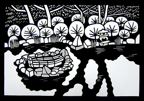 森長直は、この話を思い出し、新しく入った赤穂城の庭園に石を組み、石舟を置いたのでした。いつの日にか、18万石への復活を夢みて、その時期を待ったといいます。(赤穂市教育委員会刊『赤穂の昔話 第一集』・「赤穂城の石舟」より)=切り絵・村杉創夢