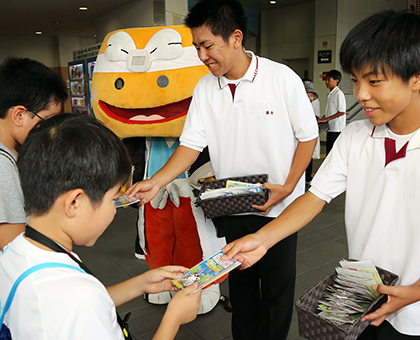 同校生徒会の福祉・ボランティア部を中心に生徒約20人が協力した。「シっカりキーつけて」の文字が入った鹿のマスコット付きキーホルダーと自転車盗の多発を警告する防犯ちらしをセットにして配布した。