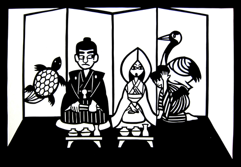 息をころして見守っていた人たちは大笑い。酒盛りはいっそうにぎやかになり、朝まで続いたということです。(赤穂市教育委員会刊『赤穂の昔話 第一集』・「引き受けたオナラ」より)=切り絵・村杉創夢