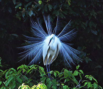 ネイチャー系写真を専門とする武村さんは今年5月上旬、佐用町円光寺の佐用川沿いの雑木林にアオサギやカワウなどが多数営巣する野鳥のコロニーを発見。純白の羽毛が美しいシラサギを被写体に定めた。