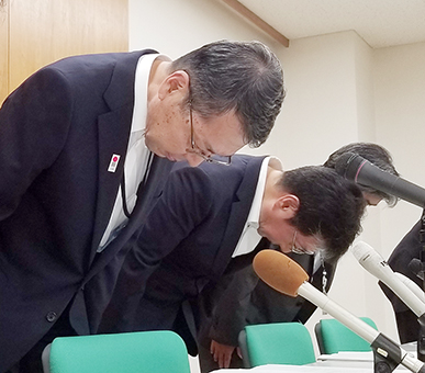 職員逮捕を受け、記者会見で謝罪する市幹部