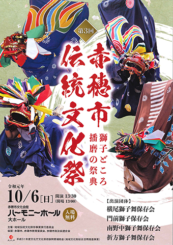 市民に伝統文化の重要性を再認識してもらおうと、「地域伝統文化保存事業実行委員会」(委員長=尾上慶昌教育長)が主催。市内の獅子舞を5回に分けて紹介するイベントの3年目で、出演順に▽横尾獅子舞保存会▽門前獅子保存会▽南野中獅子舞保存会▽折方獅子舞保存会の4団体が出演する。