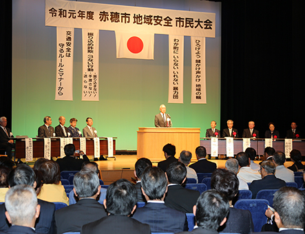 主催者を代表して牟礼正稔市長は来場者約300人を前に「地域の安全は警察署をはじめ、地域の各種団体が関わって守っている。市としてもできるところから取り組む」とあいさつした。横山博章・赤穂警察署長は「刑法犯と交通事故はいずれも前年より減少しているが、安全を実感するには至っていない」と引き締めを図り、藤野高之・大会実行委員長も緊迫する暴力団情勢を指摘した上で「『赤穂は安全』と言われるが、そうじゃない。地域の安全をより強固にする必要がある」と結束を呼び掛けた。