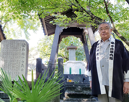 堀内伝右衛門が建立した義士遺髪塔と宮川政士さん