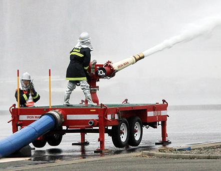 訓練は会場持ち回りで年1回実施しており、容量4万5000キロリットルの重原油タンク4基を有する同発電所では初めて。関連企業を含む35人が参加し、システムの搬入から設置、放水までの流れを確認した。1分間に最大3万8000リットルを放水できる威力があり、砲台から出された水は約120メートル先まで届いた。