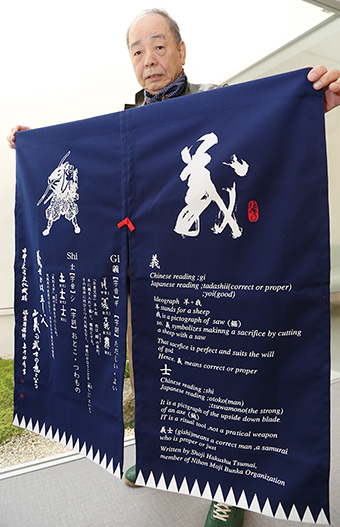 書家として「柏秀」の号を持つ妻井さんは20年ほど前から義士の肖像画と書を組み合わせた手ぬぐいやTシャツなどを製作している。「日本文字文化機構」の認定准講師として漢字研究にも熱心で、今回は「義」と「士」の漢字の成り立ちをテーマに図案化。「義士とは正しい人 正義の武士の意となる」と書した一文を添え、右半分は「海外の人たちにも忠臣蔵と漢字の文化を伝えたい」と英訳文を染め抜いた。