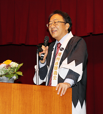 義士はっぴを羽織って講演した山本博文氏