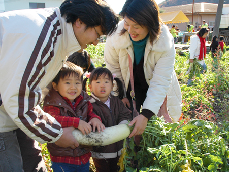 清水町の高野咲希ちゃん(2)は両親といっしょに畑で収穫体験。服に泥が付くのも気にせず、ダイコンを引っ張っていた。