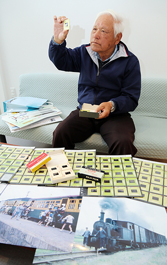 寄贈前に別府鉄道関連のネガを整理する吉栖清美さん