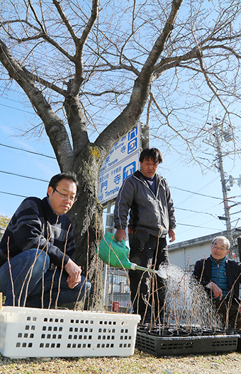 ▼地元愛着「宮前桜」を後世に=尾崎の宮前児童遊園で道路拡幅に伴い撤去が決まったソメイヨシノを後世に残そうと、地元まちづくりグループ「尾崎のまちを考える会」が挿し木による2世育成を始めた。