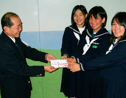 11月の「塩屋地区ふれあいふるさとまつり」でバザーの売り子として協力した赤穂西中学校の生徒が市社会福祉協議会を訪問。ボランティア委員長の田中咲希さん(15)らが「お年寄りや困っている人のために役立てて」と売上げ全額を寄付した。