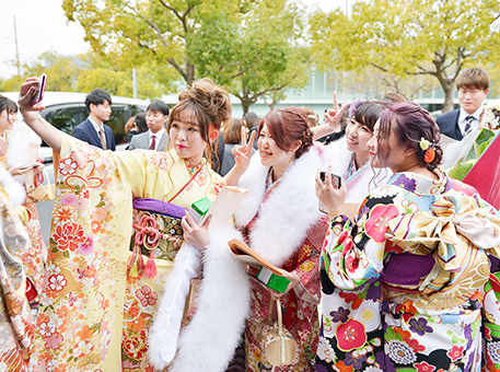 友人同士で記念写真を撮る新成人たち=赤穂市提供