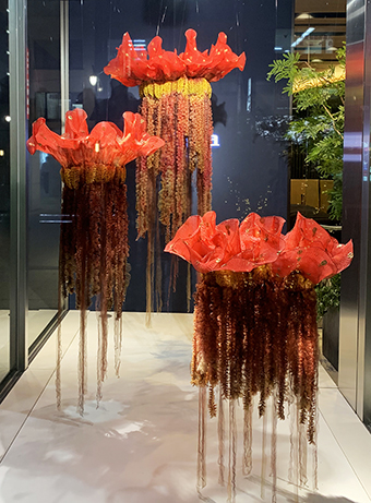 寺村さんの作品は世界最大の花とされる寄生植物をモチーフにした「ラフレシアのゆめ」。絞り染めと型染めの技法で凹凸をつけた絹布を切り貼りせずにそのまま立体に。赤いグラデーションが美しい3点一組の作品に仕上げた。